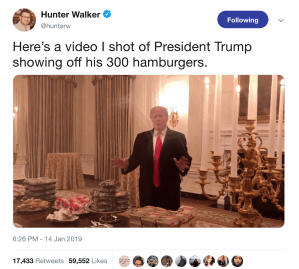 Last night, in a magnanimous effort “to make sure that everything is right” during the government shutdown, Trump treated the Clemson Tigers to 300 hundred hamburgers and “many, many french fries.” According to the WaPo, burgers and chicken nuggets were distributed on platters in the style of servers at an elegant cocktail party. “Another Big Mac, sir? Please, help yourself.” The buffet cost about $3,000.