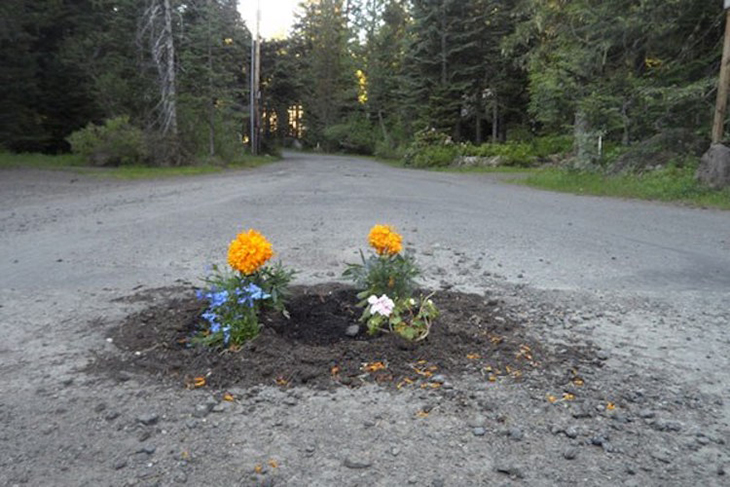 Across North America and parts of Europe, people are fed up with their complaints about neglected roads going unanswered. To get the attention of local municipalities, they fill street potholes with potting soil and flowers. Here’s are a few shots from Portland, Oregon – because Portlanders.